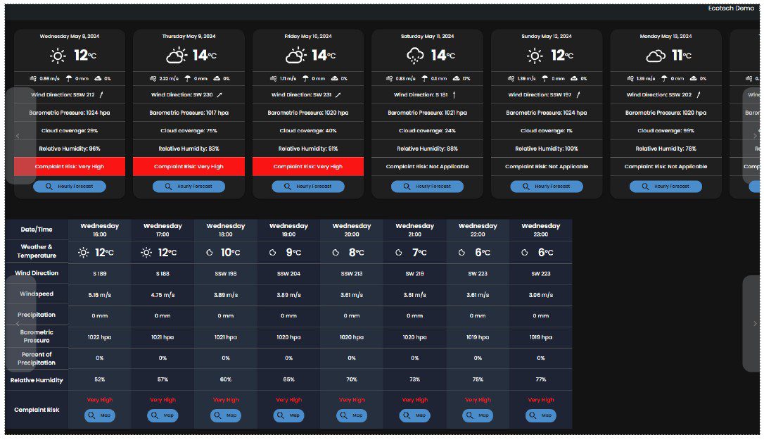 - The complaint risk level appears in the bottom right of this panel. This risk level is colour-coded and updated every hour for the next two days.
